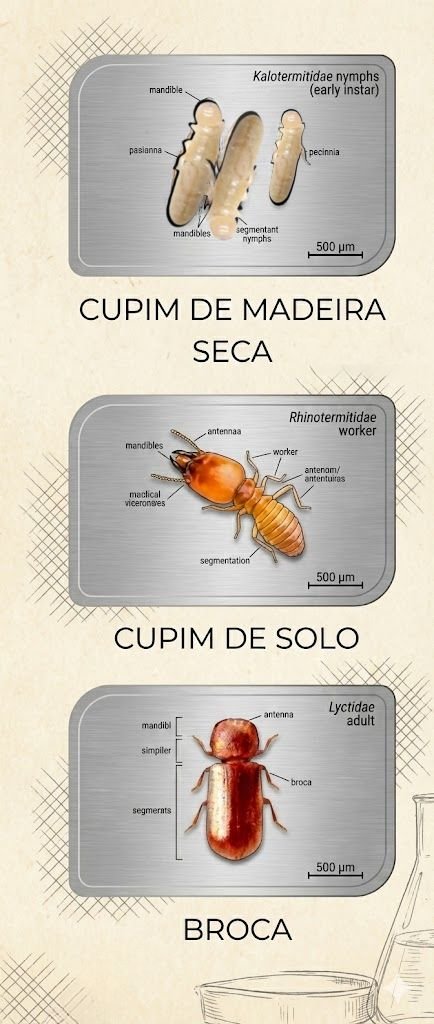 • Danos: Causam prejuízos devastadores e rápidos. Atacam não só madeira, mas gesso, papel, livros e podem danificar a estrutura do imóvel. Exigem controle técnico rigoroso.
